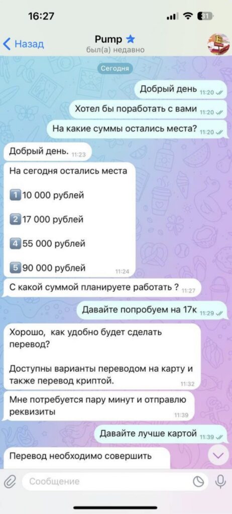 Для своих пампов команда трейдеров VelvetHaze использует ограниченный список бирж. Это малоизвестные арабские и азиатские биржи. После каждого пампа вам предложат зарегистрироваться на бирже. Затем вы сможете спокойно привязать карту и вывести средства.